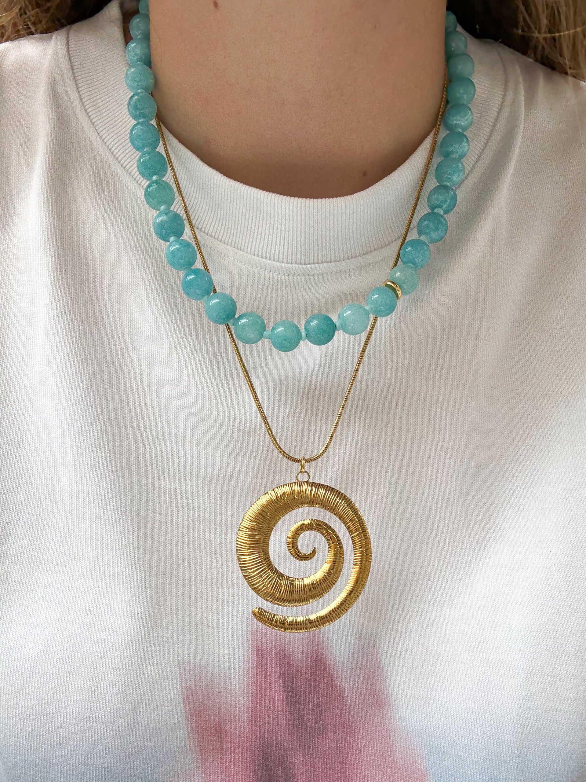 Alle materialen worden ingekocht, maar met liefde gemaakt door Sanne (founder). Turquoise jade is verbonden met innerlijke rust en zelfvertrouwen. De gouden spiraal staat symbool voor je eigen reis naar binnen en de oneindige groei die je doormaakt. Een sieraad dat je helpt thuiskomen bij jezelf, elke dag opnieuw.